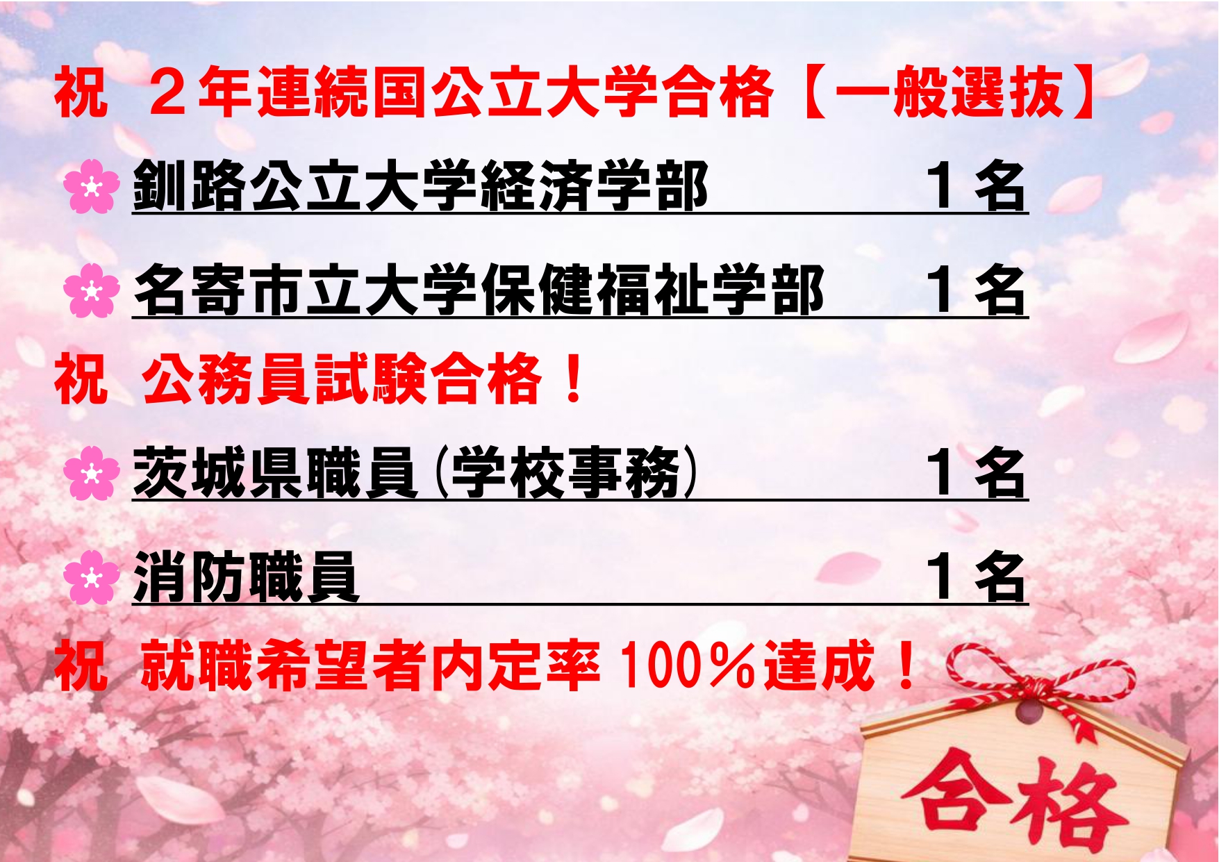 筑波技術大1名、法政大1名、東京農業大1名、常磐大8名、茨城キリスト教大8名、茨城中央看護専門2名、他多数 詳細は ▶ 進路情報 のページをご覧ください。